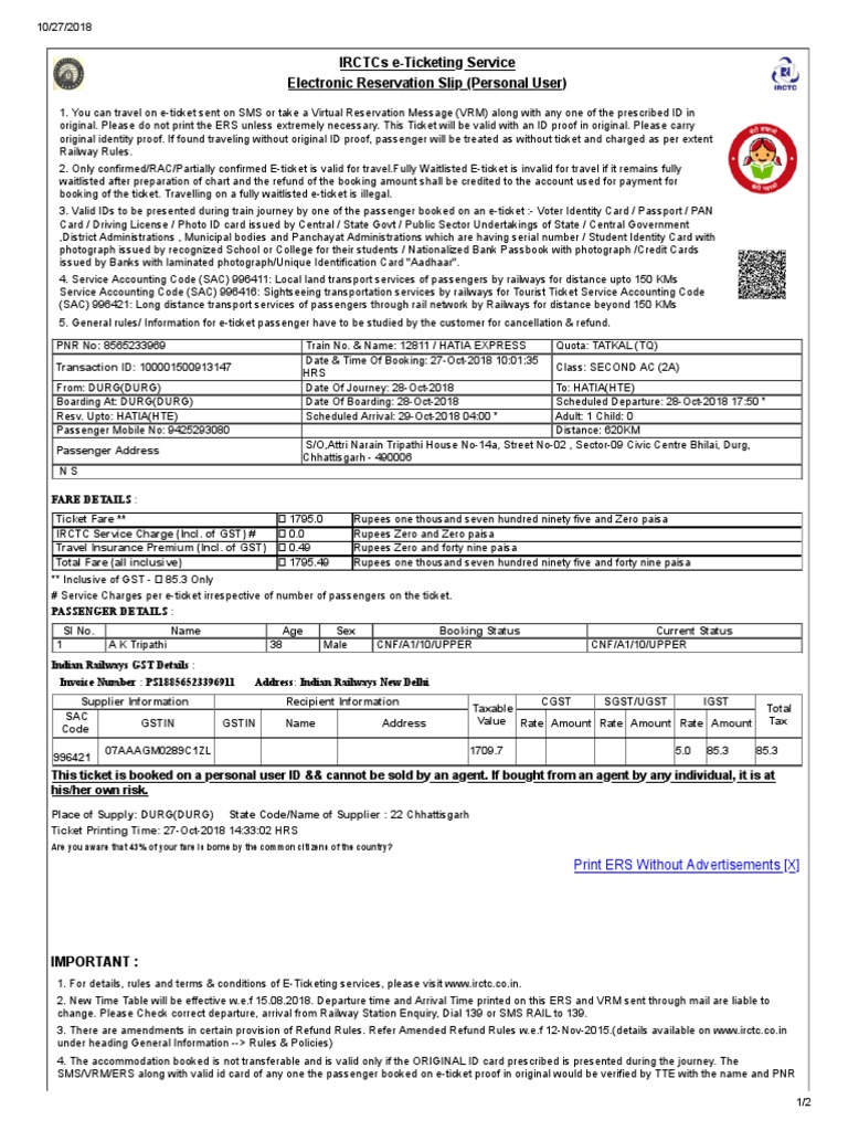 original. Please do not print the ERS unless extremely necessary. This Ticket will be valid with an ID proof in original. Please carry