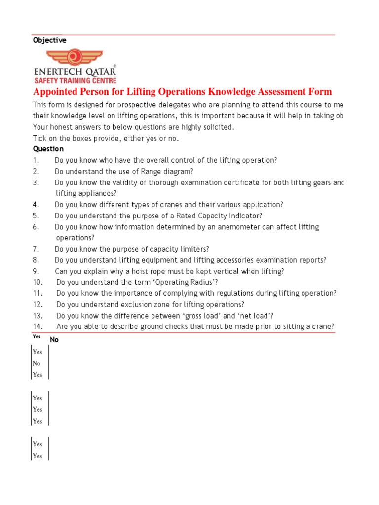 Appointed Person for Lifting Operations Knowledge Assessment Form