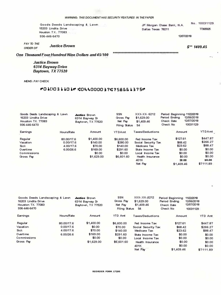 Houston TX. 77083 Baytown, TX 77520 Net Pay $1,409.46 Check Date 12/07/2018