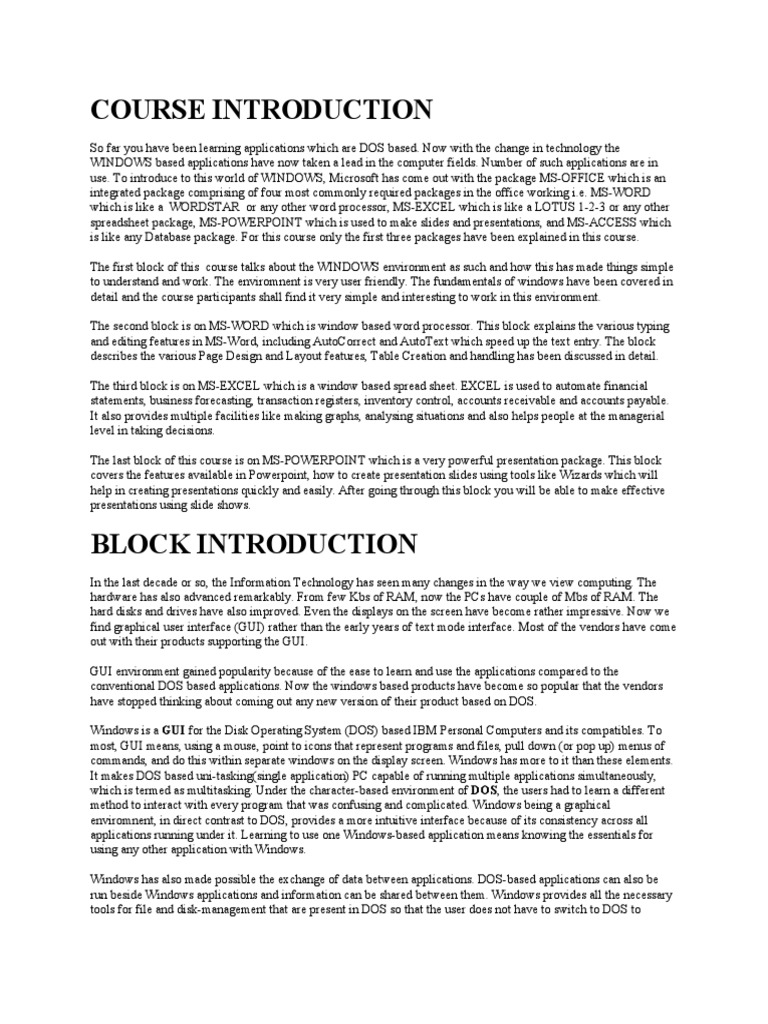 The first block of this course talks about the WINDOWS environment as such and how this has made things simple