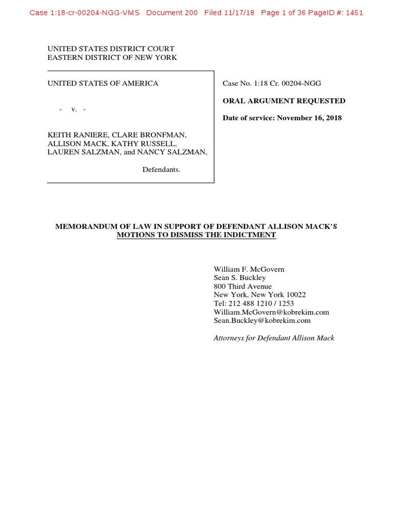 MEMORANDUM OF LAW IN SUPPORT OF DEFENDANT ALLISON MACK