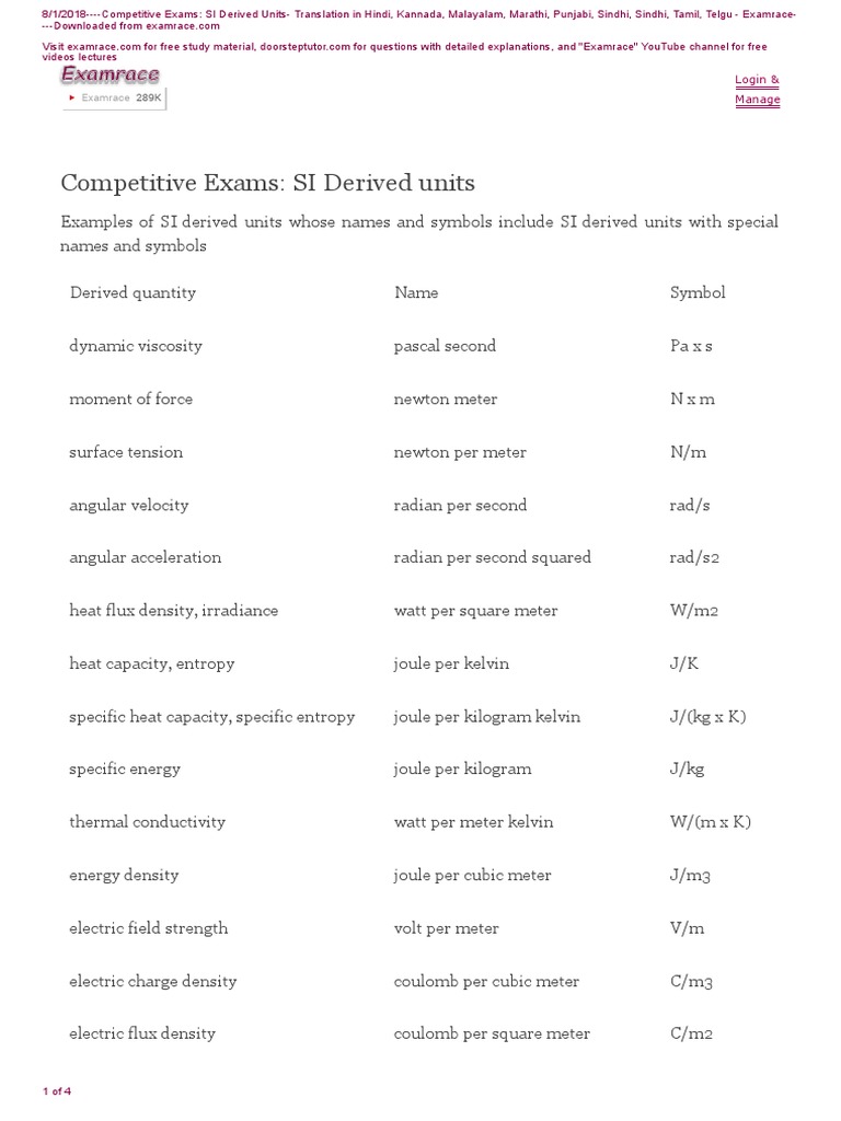 8/1/2018----Competitive Exams: SI Derived Units- Translation in Hindi, Kannada, Malayalam, Marathi, Punjabi, Sindhi, Sindhi, Tamil, Telgu - Examrace-