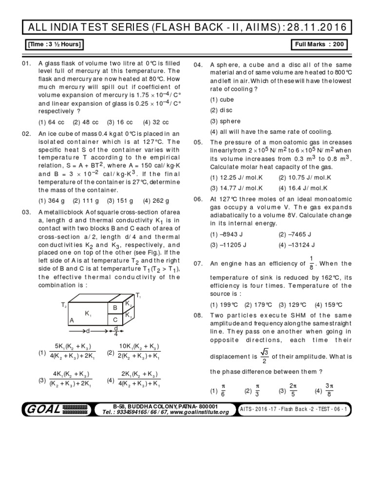 01. A glass flask of volume two litre at 0°C is filled 04. A sph ere, a cube and a disc all of the same