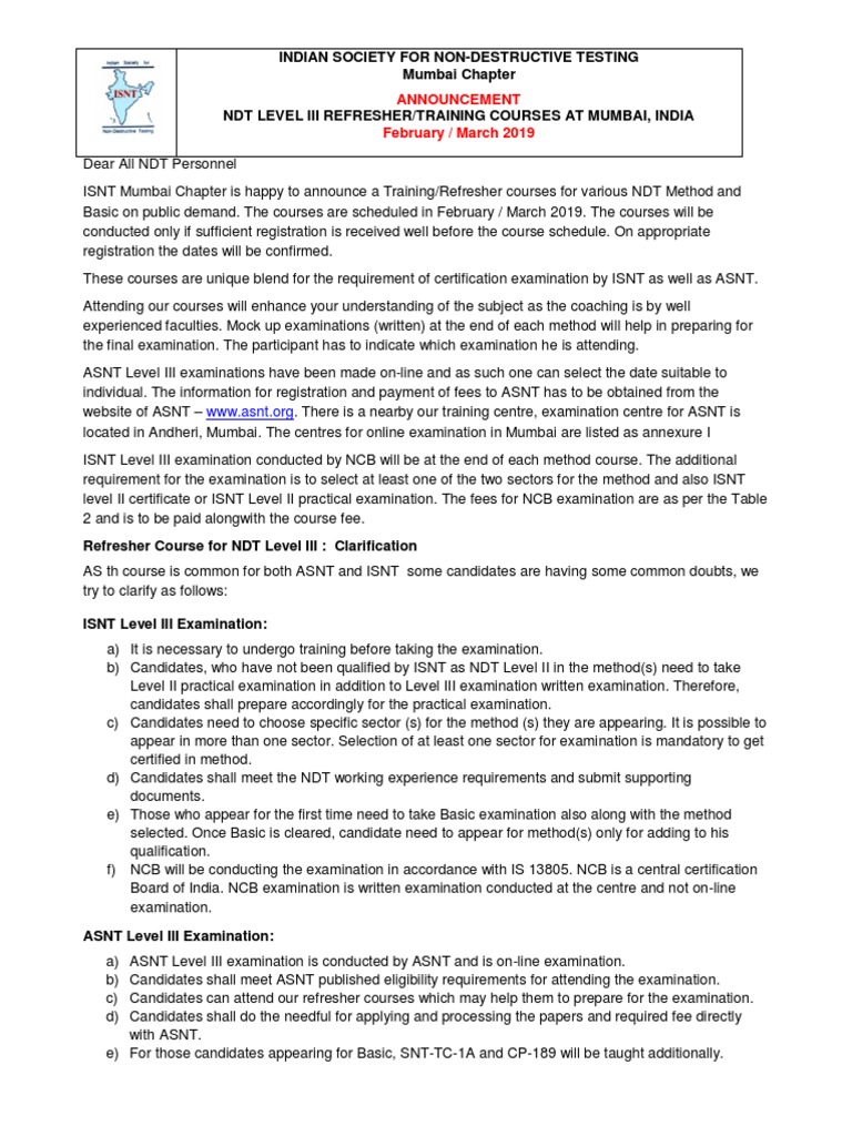 ISNT Mumbai Chapter is happy to announce a Training/Refresher courses for various NDT Method and
