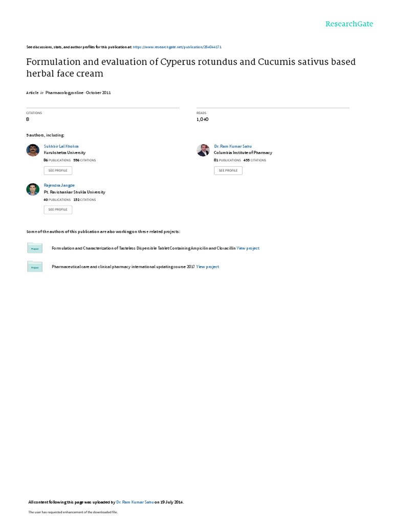 Key words Cyperus rotundus, Cucumis sativus, almond oil, herbal face cream.
