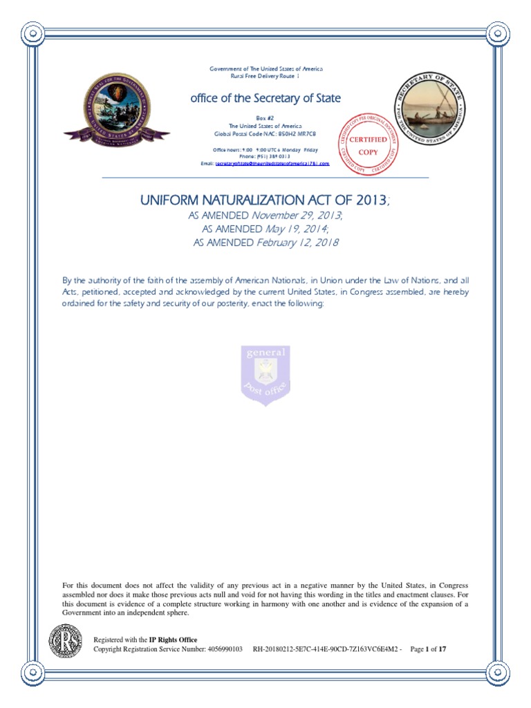 BE IT ENACTED, by the United States, in Congress assembled the UNIFORM NATURALIZATION ACT OF 2013; AS