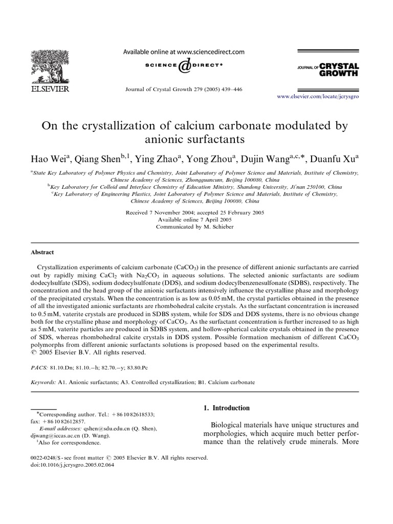 Keywords: A1. Anionic surfactants; A3. Controlled crystallization; B1. Calcium carbonate