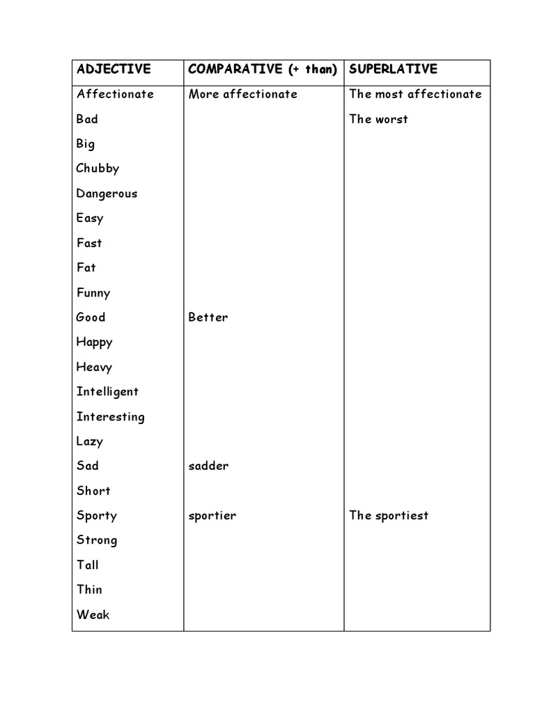 This document lists various adjectives and their comparative and superlative forms. It provides the suffixes or modifiers needed to change adjectives into their comparative (+ than) and superlative forms to indicate increasing levels of each quality. Some adjectives have irregular comparative and superlative forms like good, bad, and well.