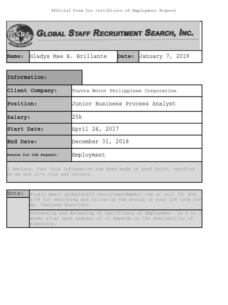 Processing and Releasing of Certificate of Employment is 2 to 3