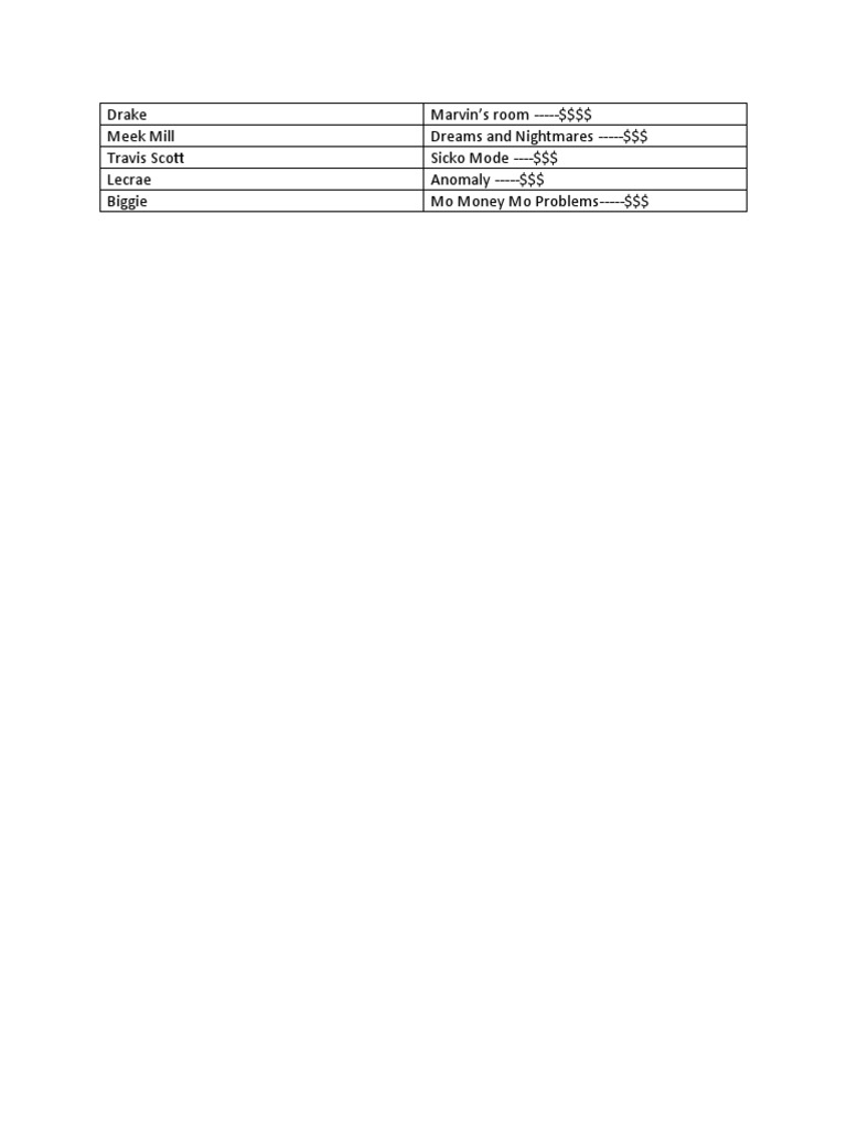 This document lists 5 hip hop artists and songs and rates them with dollar signs, with Drake's "Marvin's Room" rated the highest with 4 dollar signs, followed by Meek Mill's "Dreams and Nightmares" and Travis Scott's "Sicko Mode" each rated with 3 dollar signs, and Lecrae's "Anomaly" also rated with 3 dollar signs, and The Notorious B.I.G.'s "Mo Money Mo Problems" also rated with 3 dollar signs.