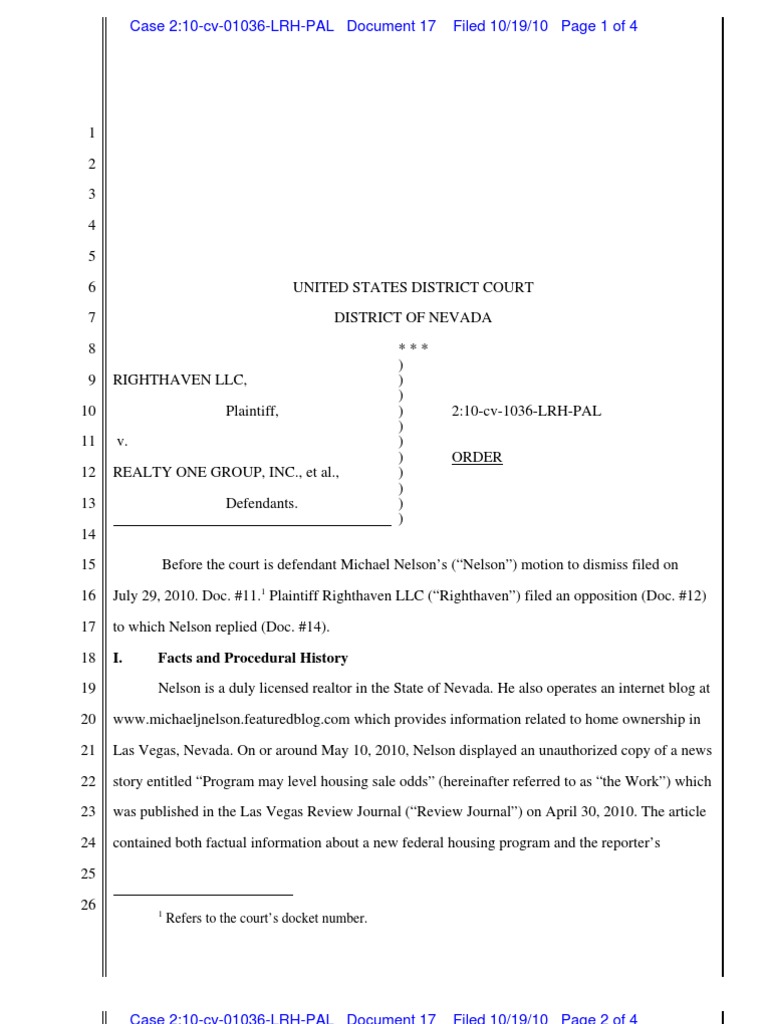 16 July 29, 2010. Doc. #11.1 Plaintiff Righthaven LLC (“Righthaven”) filed an opposition (Doc. #12)