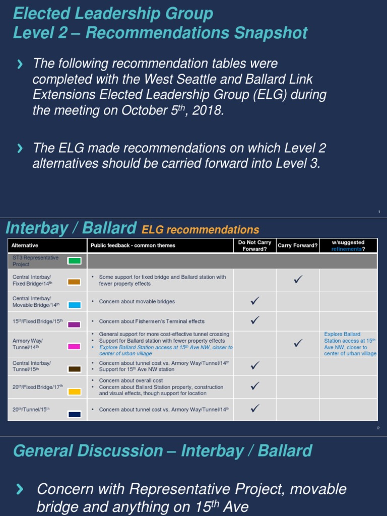 The following recommendation tables were completed with the West Seattle and Ballard Link Extensions Elected Leadership Group (ELG) during the meeting on October 5