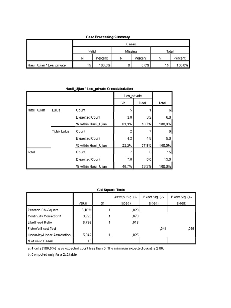 Hasil_Ujian * Les_private 15 100,0% 0 0,0% 15 100,0%