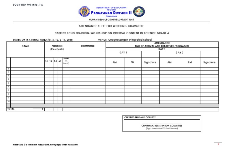 ATTENDANCE SHEET FOR WORKING COMMITTEE