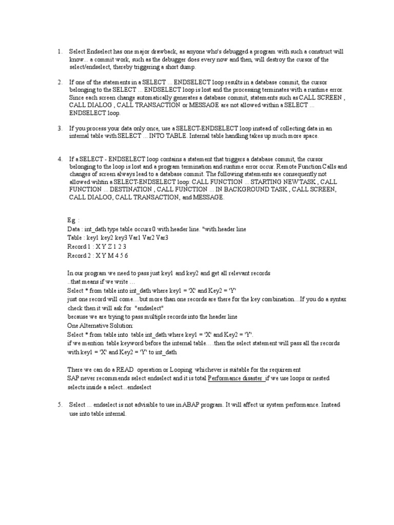 5. Select ... endselect is not advisible to use in ABAP program. It will affect ur system performance. Instead