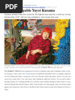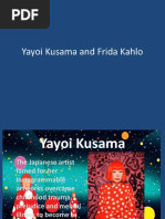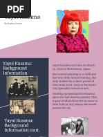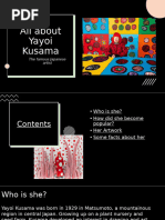 Yayoi Kusama is an artist known for her unique style incorporating polka dots and repetition across various mediums. She often includes herself in her artwork, which some analysts believe is related to her struggles with mental health issues and a desire for self-reflection. Her unconventional artwork has gained her international recognition as one of the most important living artists today.