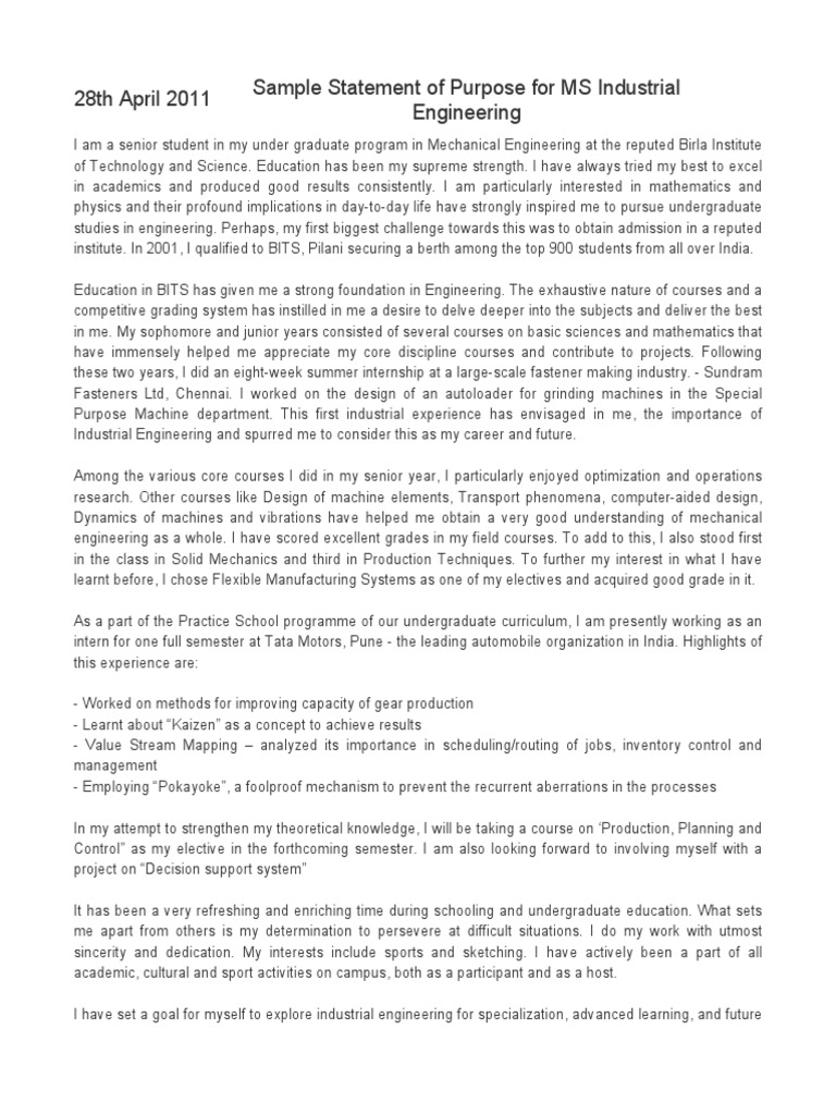 Sample Statement of Purpose for MS Industrial