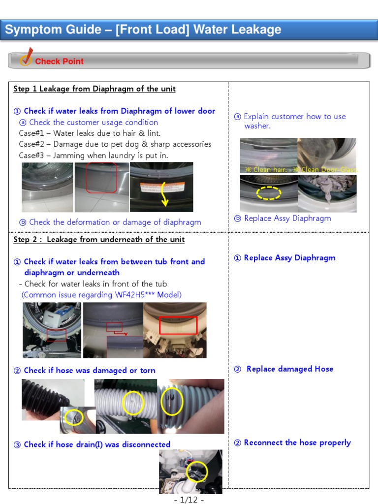 ① Check if water leaks from between tub front and ① Replace Assy Diaphragm