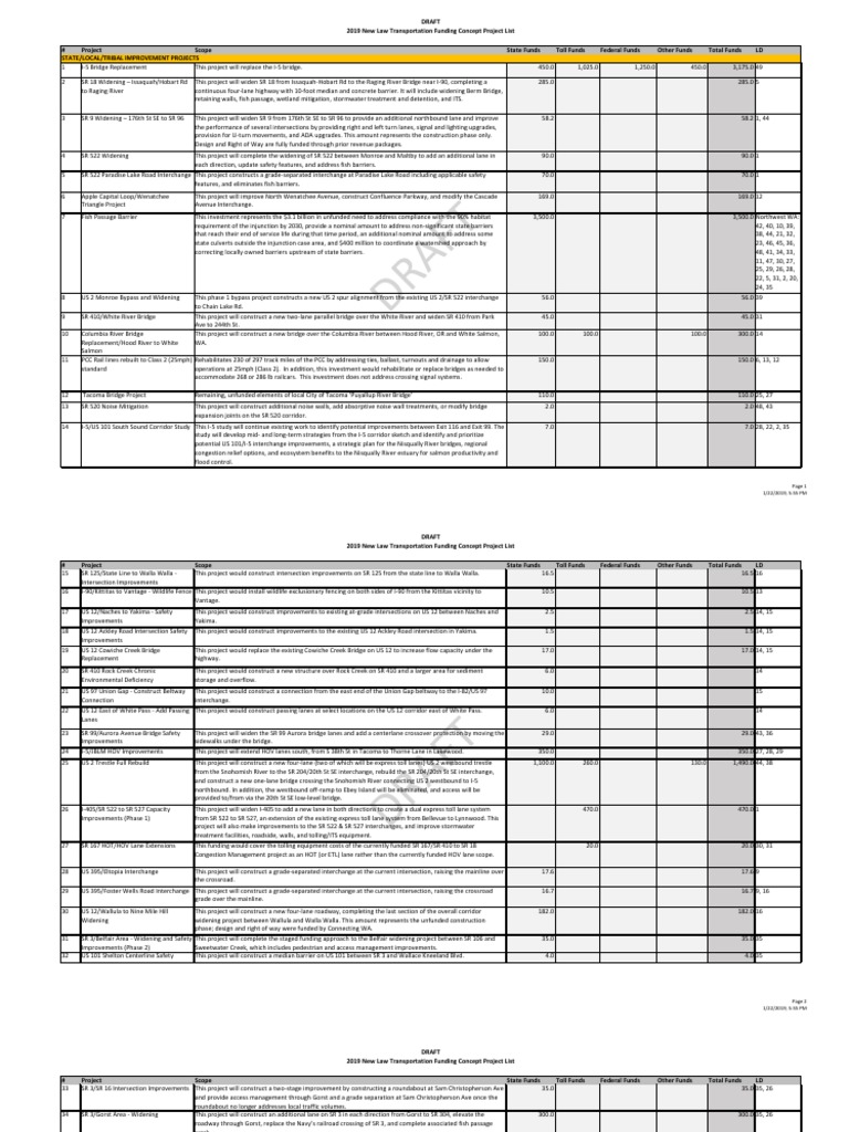 15SR 125/State Line to Walla Walla - Intersection ImprovementsThis project would construct intersection improvements on SR 125 from the state line to Walla Walla.16.516.51616I-90/Kittitas to Vantage - Wildlife FenceThis project would install wildlife exclusionary fencing on both sides of I-90 from the Kittitas vicinity to Vantage.10.510.51317US 12/Naches to Yakima - Safety ImprovementsThis project would construct improvements to existing at-grade intersections on US 12 between Naches and Yakima.2.52.514, 1518US 12 Ackley Road Intersection Safety ImprovementsThis project would construct improvements to the existing US 12 Ackley Road intersection in Yakima.1.51.514, 1519US 12 Cowiche Creek Bridge ReplacementThis project would replace the existing Cowiche Creek Bridge on US 12 to increase flow capacity under the highway.17.017.014, 1520SR 410 Rock Creek Chronic Environmental DeficiencyThis project would construct a new structure over Rock Creek on SR 410 and a larger area for sediment storage and overflow.6.01421US 97 Union Gap - Construct Beltway ConnectionThis project would construct a connection from the east end of the Union Gap beltway to the I-82/US 97 interchange.10.01522US 12 East of White Pass - Add Passing LanesThis project would construct passing lanes at select locations on the US 12 corridor east of White Pass.6.01423SR 99/Aurora Avenue Bridge Safety Improvements This project will widen the SR 99 Aurora bridge lanes and add a centerlane crossover protection by moving the sidewalks under the bridge.29.029.043, 3624I-5/JBLM HOV ImprovementsThis project will extend HOV lanes south, from S 38th St in Tacoma to Thorne Lane in Lakewood.350.0350.027, 28, 2925US 2 Trestle Full RebuildThis project will construct a new four-lane (two of which will be express toll lanes) US 2 westbound trestle from the Snohomish River to the SR 204/20th St SE interchange, rebuild the SR 204/20th St SE interchange, and construct a new one-lane bridge crossing the Snohomish River connecting US 2 westbound to I-5 northbound. In addition, the westbound off-ramp to Ebey Island will be eliminated, and access will be provided to/from via the 20th St SE low-level bridge.1,100.0260.0130.01,490.044, 3826I-405/SR 522 to SR 527 Capacity Improvements (Phase 1)This project will widen I-405 to add a new lane in both directions to create a dual express toll lane system from SR 522 to SR 527, an extension of the existing express toll lane system from Bellevue to Lynnwood. This project will also make improvements to the SR 522 & SR 527 interchanges, and improve stormwater treatment facilities, roadside, walls, and tolling/ITS equipment.470.0470.0127SR 167 HOT/HOV Lane Extensions This funding would cover the tolling equipment costs of the currently funded SR 167/SR 410 to SR 18 Congestion Management project as an HOT (or ETL) lane rather than the currently funded HOV lane scope.20.020.030, 3128US 395/Eltopia InterchangeThis project will construct a grade-separated interchange at the current intersection, raising the mainline over the crossroad.17.617.6929US 395/Foster Wells Road InterchangeThis project will construct a grade-separated interchange at the current intersection, raising the crossroad grade over the mainline.16.716.79, 1630US 12/Wallula to Nine Mile Hill WideningThis project will construct a new four-lane roadway, completing the last section of the overall corridor widening project between Wallula and Walla Walla. This amount represents the unfunded construction phase; design and right of way were funded by Connecting WA.182.0182.01631SR 3/Belfair Area - Widening and Safety Improvements (Phase 2)This project will complete the staged funding approach to the Belfair widening project between SR 106 and Sweetwater Creek, which includes pedestrian and access management improvements.35.035.03532US 101 Shelton Centerline SafetyThis project will construct a median barrier on US 101 between SR 3 and Wallace Kneeland Blvd.4.04.035