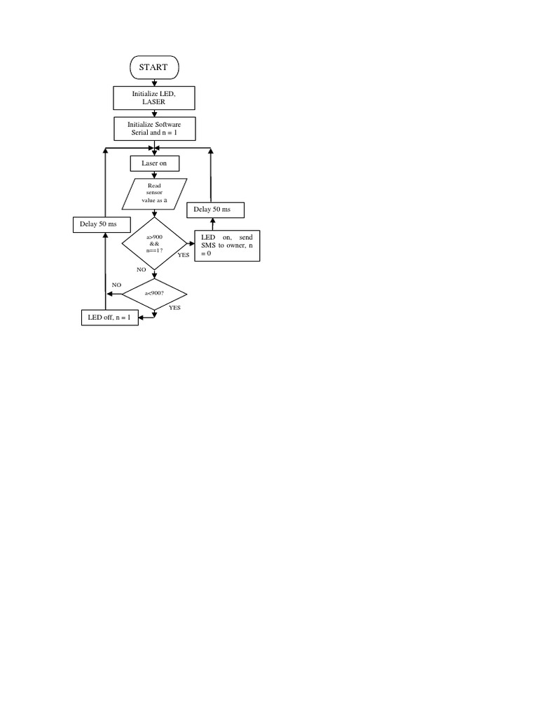 The document describes initializing an LED, laser, and software serial before turning on the laser and reading a sensor value. If the value is above 900 and it is the first reading, the LED turns on, an SMS is sent to the owner, and the reading counter resets to 0. Otherwise, if the value is below 900, the LED turns off and the reading counter increments.