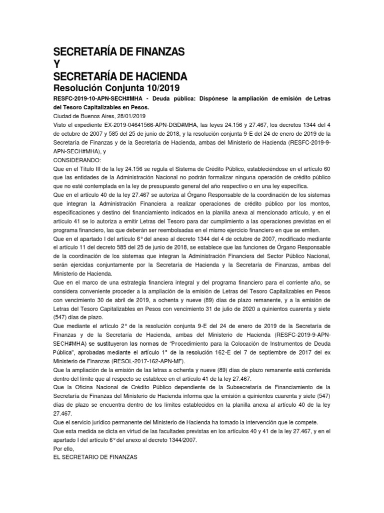 RESFC-2019-10-APN-SECH#MHA - Deuda pública: Dispónese la ampliación de emisión de Letras
