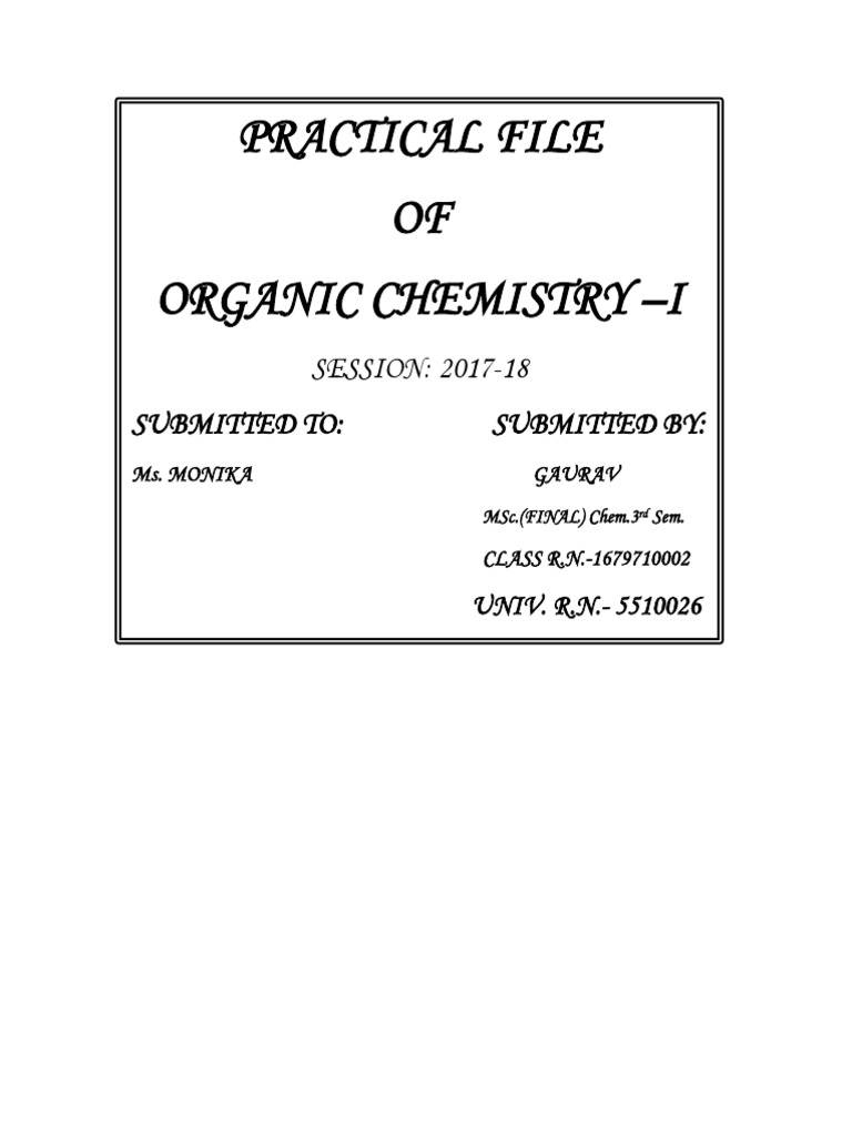 This document is a practical file submitted by Gaurav, a third semester MSc chemistry student, to his instructor Monika for the organic chemistry course in the 2017-2018 academic session. The file contains practical work and assignments completed by Gaurav for organic chemistry.