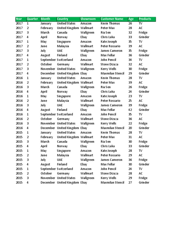 Year Quarter Month Country Showroom Customer Name Age Products