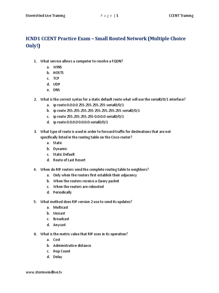ICND1 CCENT Practice Exam – Small Routed Network (Multiple Choice