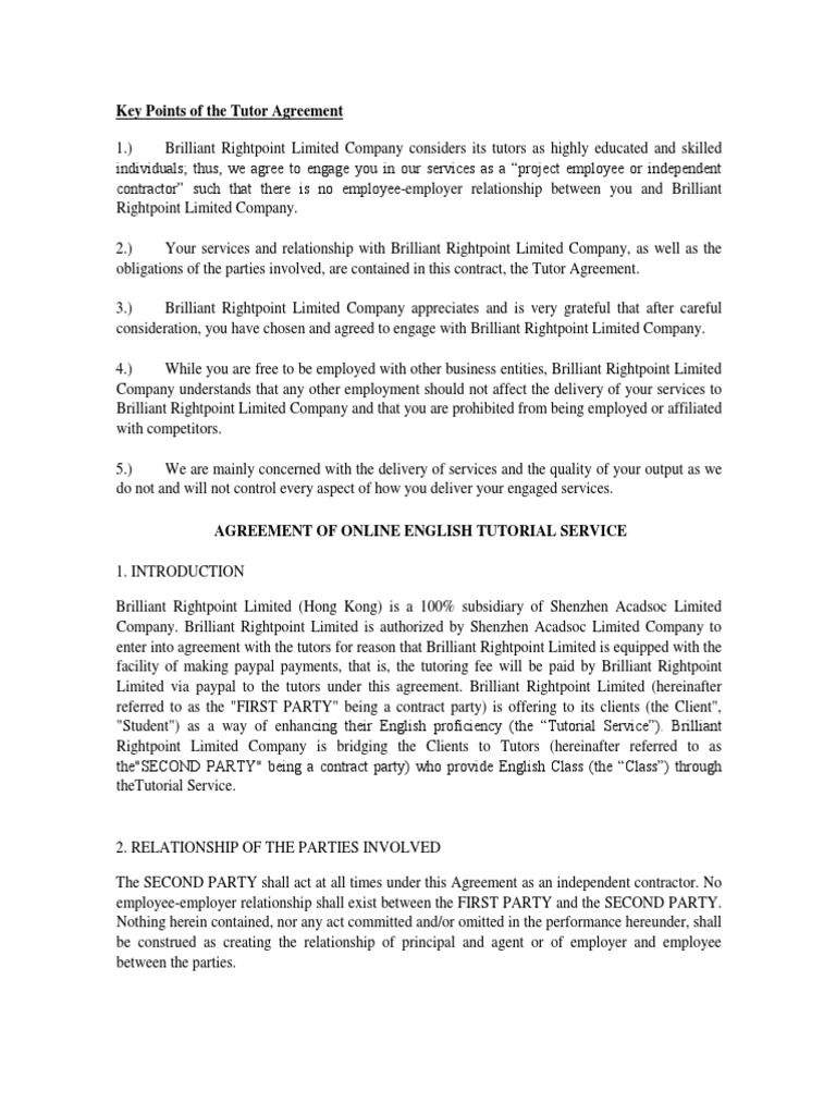 enter into agreement with the tutors for reason that Brilliant Rightpoint Limited is equipped with the