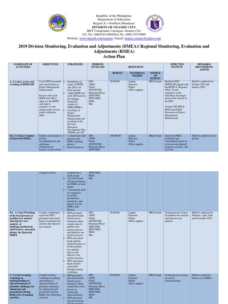 B.2. 4 (1 day)Workshop Conduct workshop to SDO personnel SDS 50,000.00 Laptop HRLD funds Trained process owners Shall be conducted in