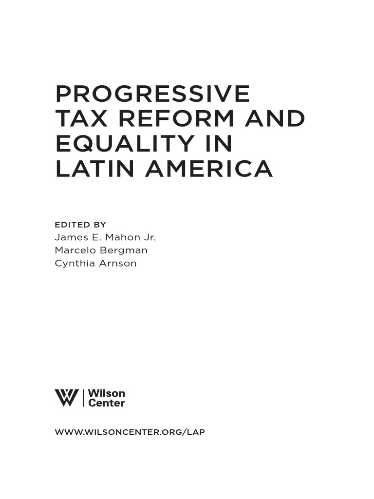 Tis book represents the culmination of the Latin American Program’s three-year project on the politics of progressive taxation in Latin America. We are grateful to the inker Foundation for its generous support of this initiative. We are also grateful to numerous colleagues from throughout the region who have contributed their expertise at various stages of the project, either as conference participants at events sponsored by the Woodrow Wilson International Center for Scholars in 2011 and 2012 or as authors of pre-viously published case studies: José Roberto Afonso, Martín Ardanaz, Alberto Barreix, Carlos Elizondo, Laura Frigenti, Juan Carlos Gómez Sabaini, Juan Pablo Jiménez, Stephen Kaplan, Santiago Levy, Eduardo Lora, Nora Lustig, Marcus Melo, Gabriel Ondetti, Natalia Salazar, Saulo Santos de Souza, John Scott, and Vito anzi. Teir comments, perspectives, and advice have greatly enriched our inquiry.In 2013 and 2014, we collaborated with institutions in Mexico, Costa Rica, and Colombia in sponsoring regional forums on tax reform. For their leadership and cooperation in these joint efforts, we express our thanks to Hugo Beteta, of the Comisión Económica para América Latina y el Caribe, in Mexico; to Jorge Vargas Cullell, of Programa Estado de la Nación, and to Armando González, of
