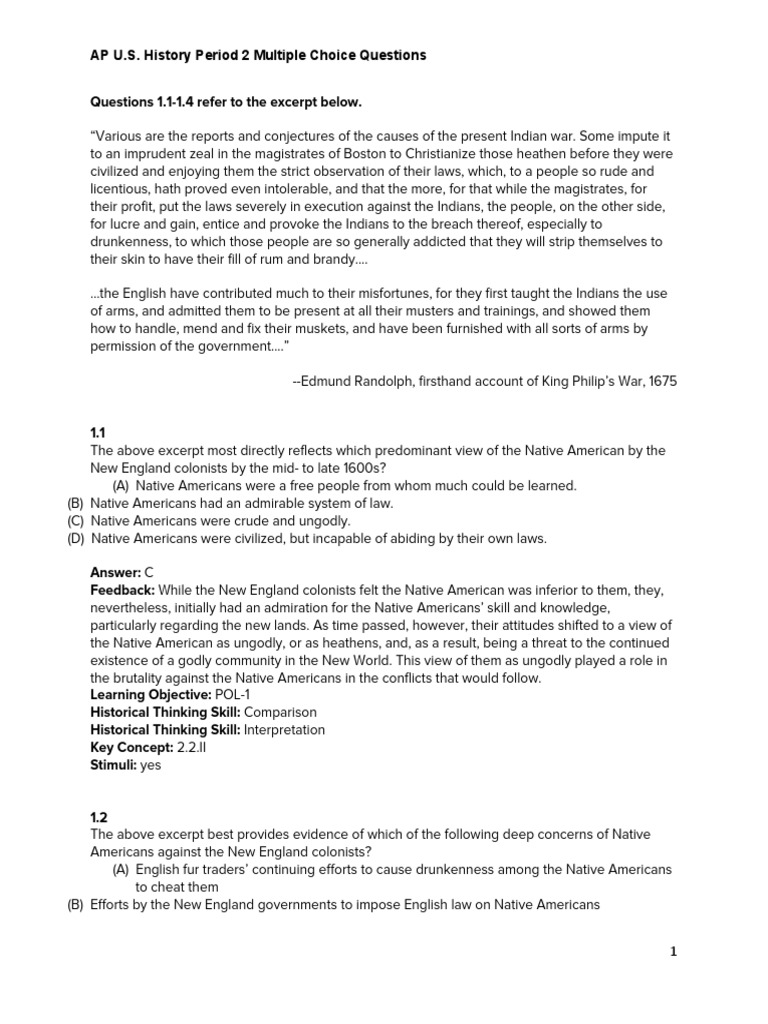 AP U.S. History Period 2 Multiple Choice Questions