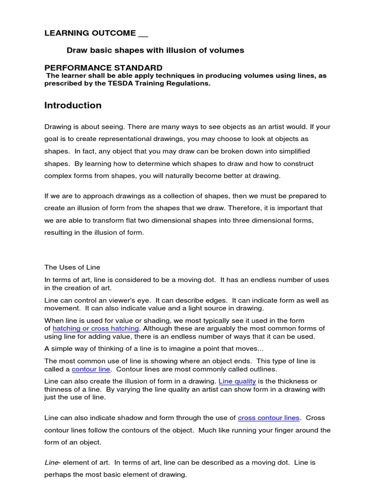 The learner shall be able apply techniques in producing volumes using lines, as