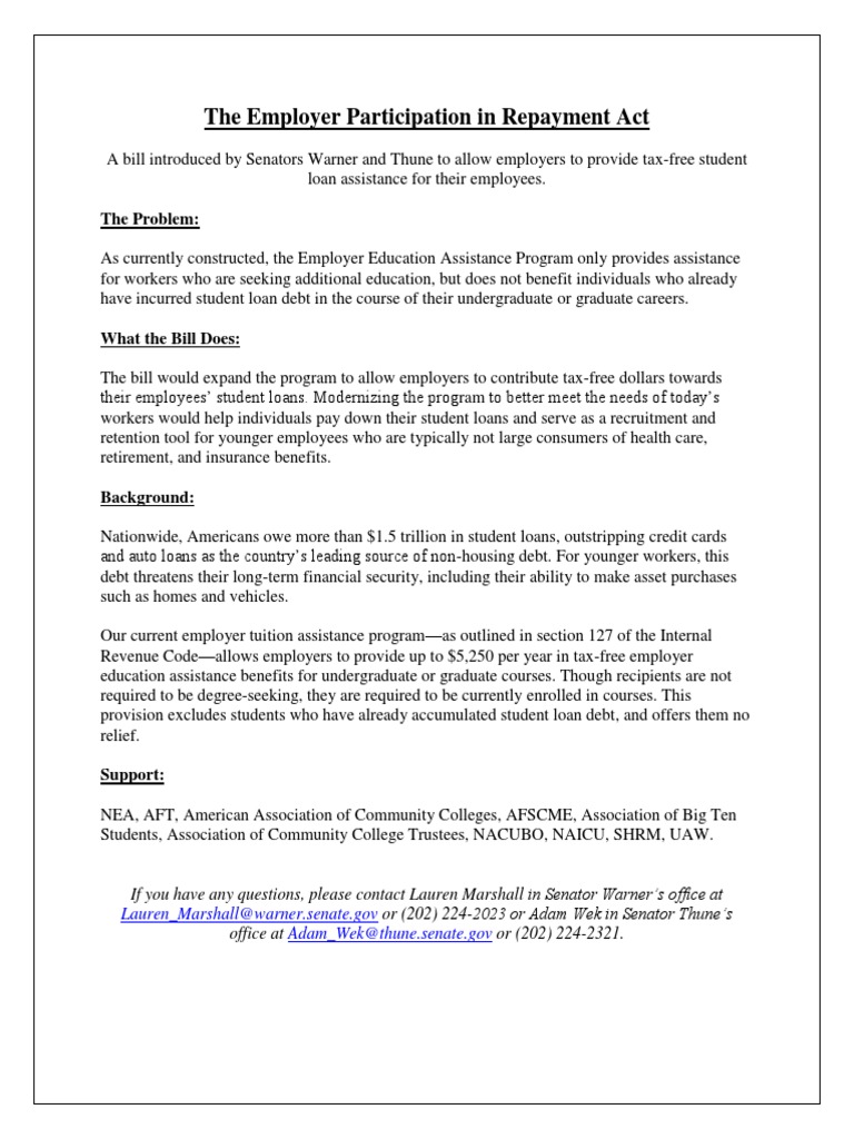 A bill introduced by Senators Warner and Thune to allow employers to provide tax-free student