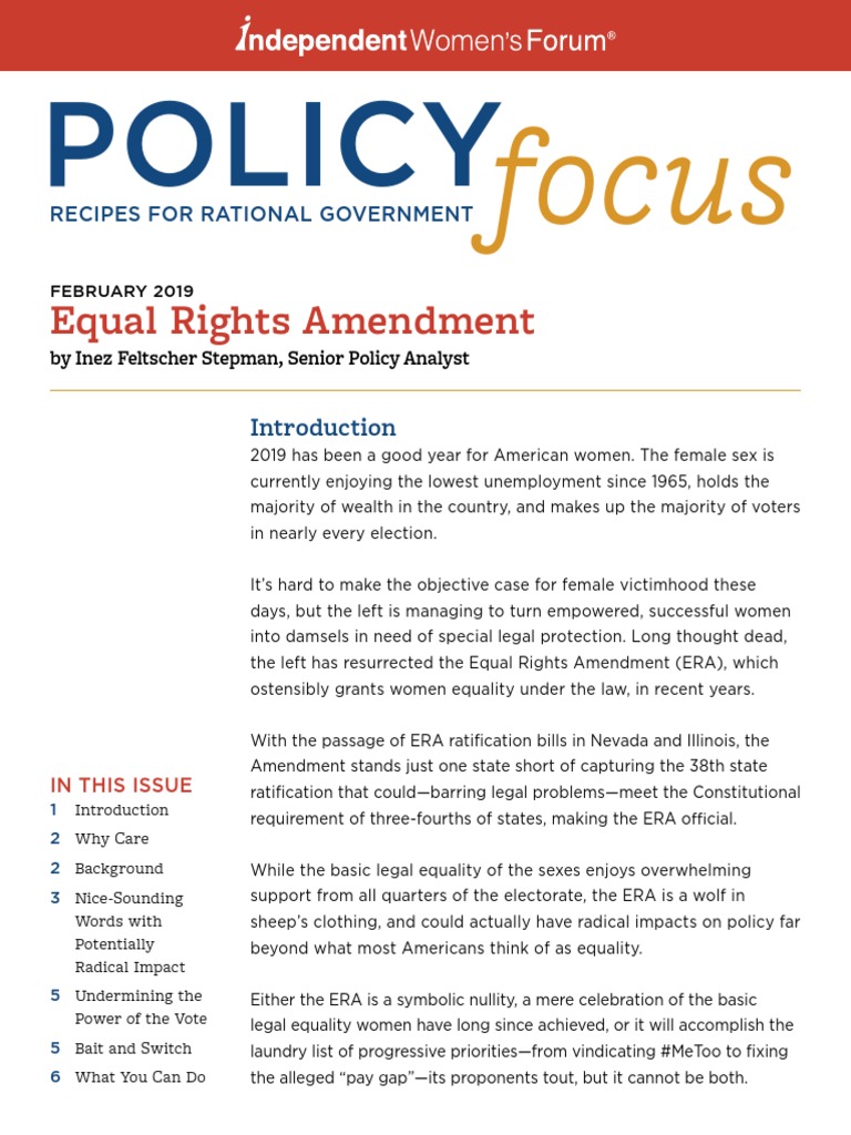 While the basic legal equality of the sexes enjoys overwhelming support from all quarters of the electorate, the ERA is a wolf in sheep’s clothing, and could actually have radical impacts on policy far beyond what most Americans think of as equality.