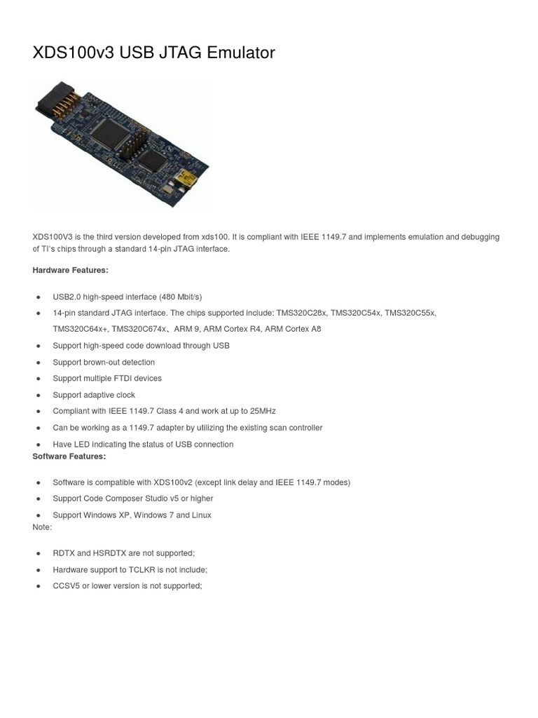 XDS100V3 is the third version developed from xds100. It is compliant with IEEE 1149.7 and implements emulation and debugging