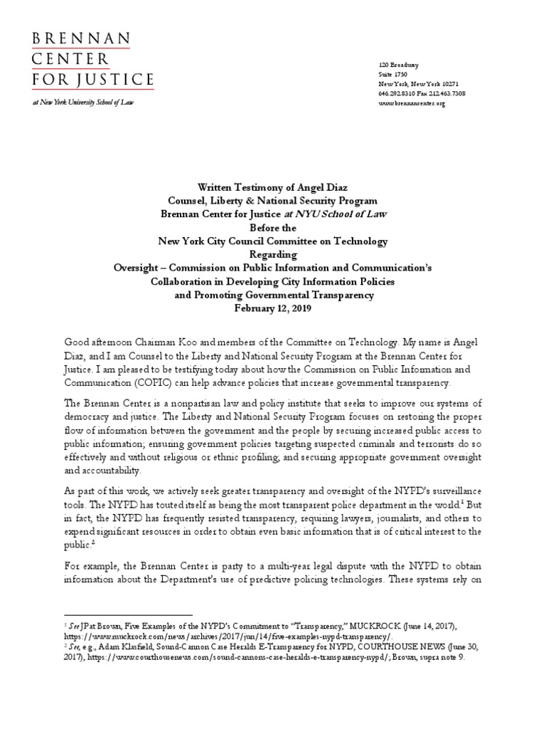Angel Diaz - Testimony To NYCC Committee On Tech