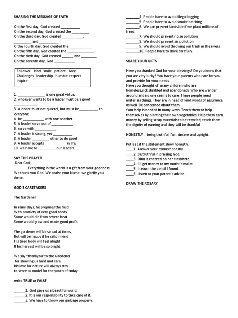 Everything in the world is a gift from your goodness. ____5. I return the pencil I found.