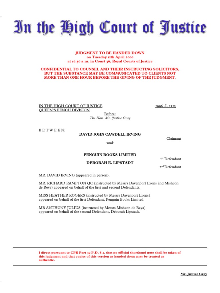 . Needless to say, the context in which these issues fall to be . The Defendant, Deborah Lipstadt, lives and works in the