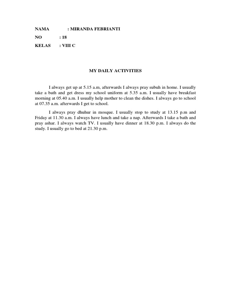 morning at 05.40 a.m. I usually help mother to clean the dishes. I always go to school