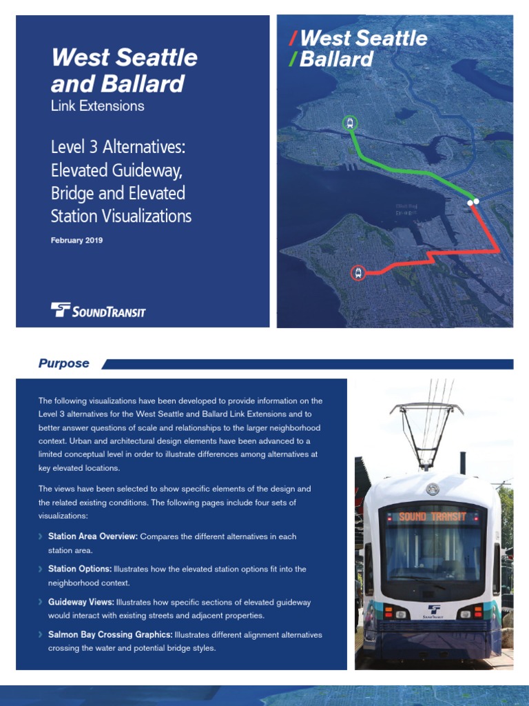 The following visualizations have been developed to provide information on the Level 3 alternatives for the West Seattle and Ballard Link Extensions and to better answer questions of scale and relationships to the larger neighborhood context. Urban and architectural design elements have been advanced to a limited conceptual level in order to illustrate differences among alternatives at key elevated locations. The views have been selected to show specific elements of the design and the related existing conditions. The following pages include four sets of visualizations: