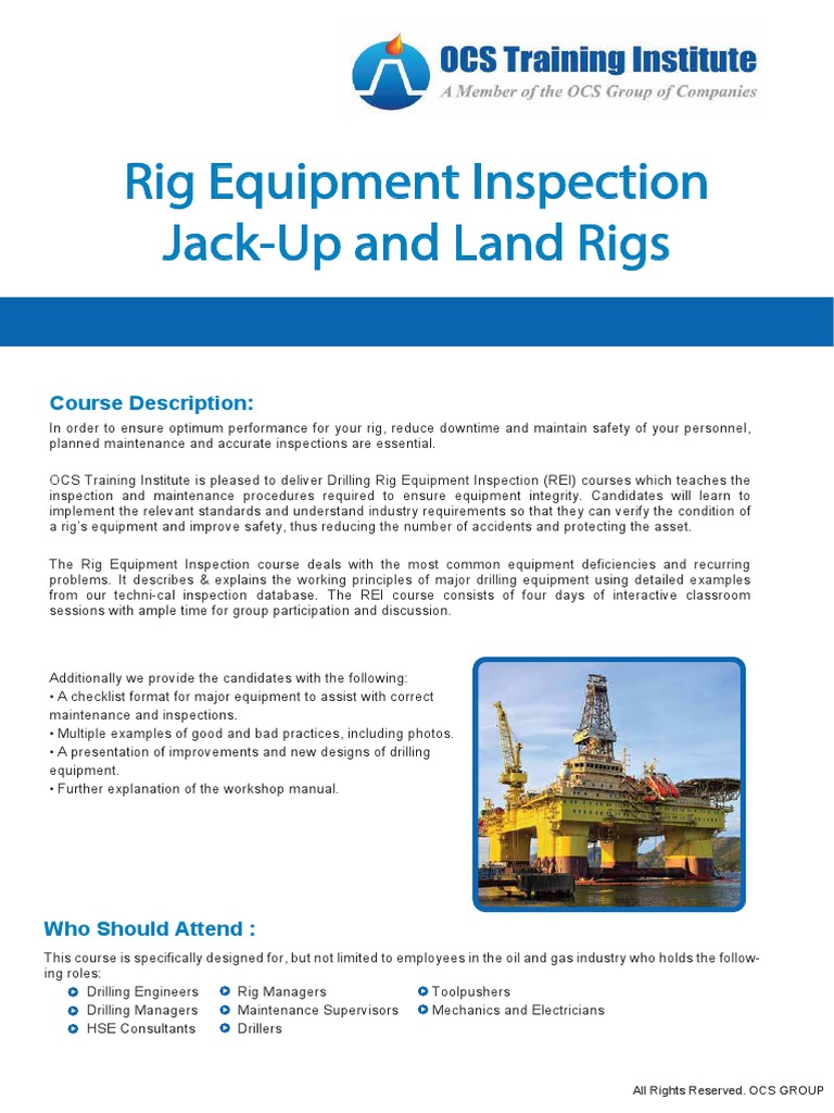 OCS Training Institute is pleased to deliver Drilling Rig Equipment Inspection (REI) courses which teaches the