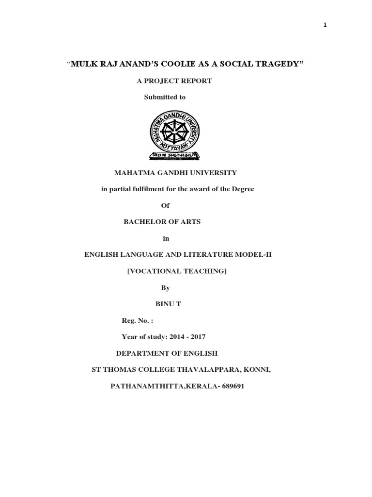 This is to certify that the Project entitled “MULK RAJ ANAND’S COOLIE AS A