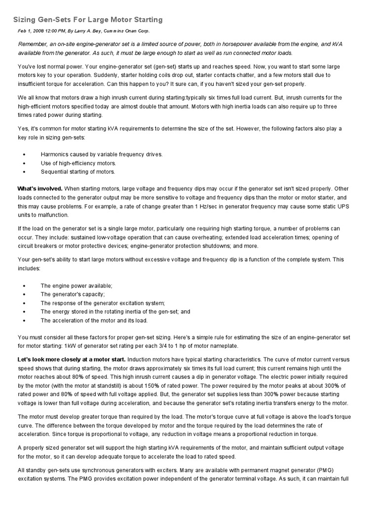 Remember, an on-site engine-generator set is a limited source of power, both in horsepower available from the engine, and kVA