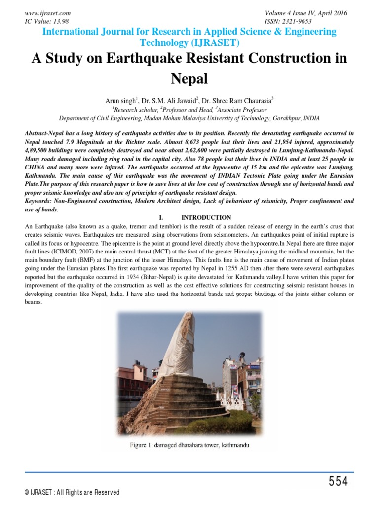 Abstract-Nepal has a long history of earthquake activities due to its position. Recently the devastating earthquake occurred in