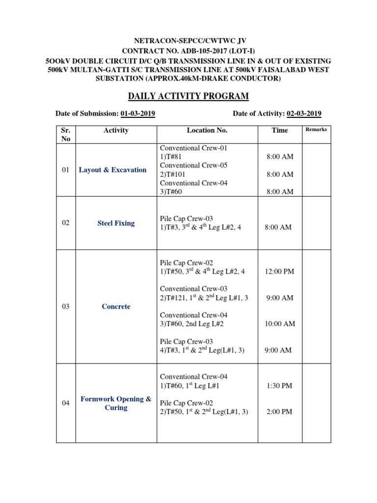Sr. Activity Location No. Time Remarks