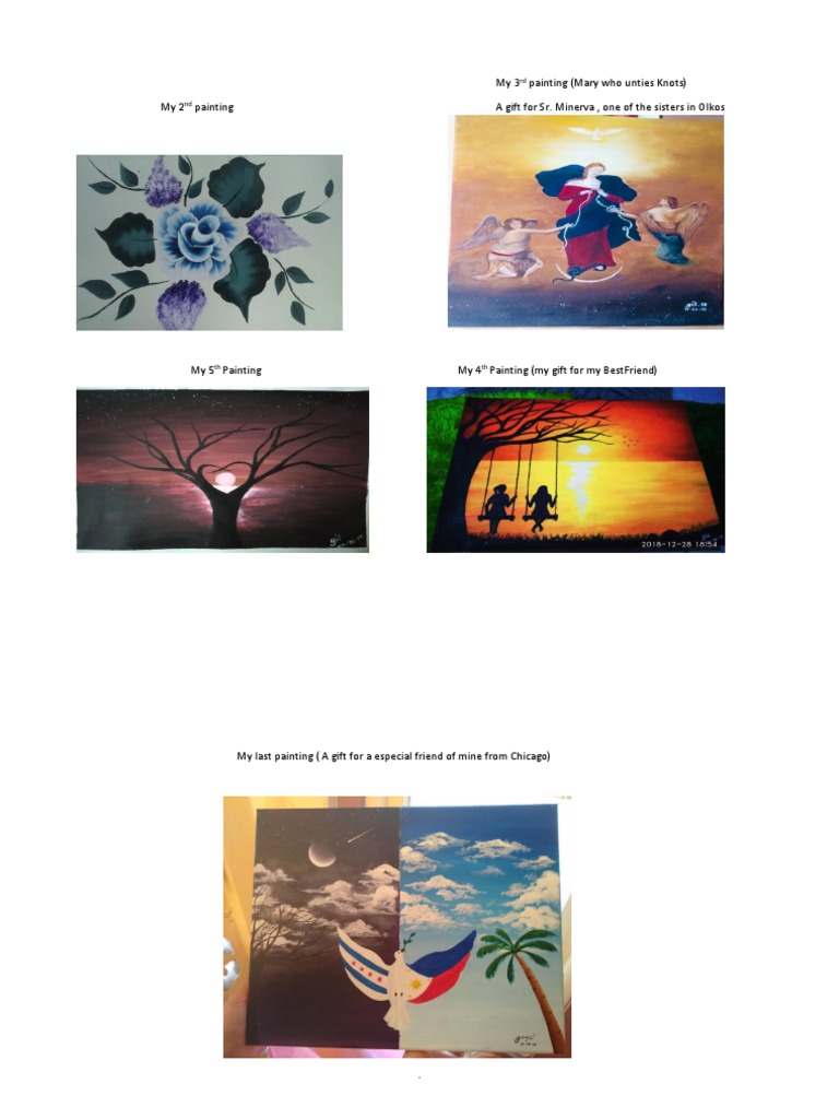 This document lists 6 paintings by number and includes brief descriptions of each painting's subject or intended recipient. The paintings are numbered from 1st to last and include portraits of Mary, Sister Minerva, the artist's best friend, and a friend from Chicago.