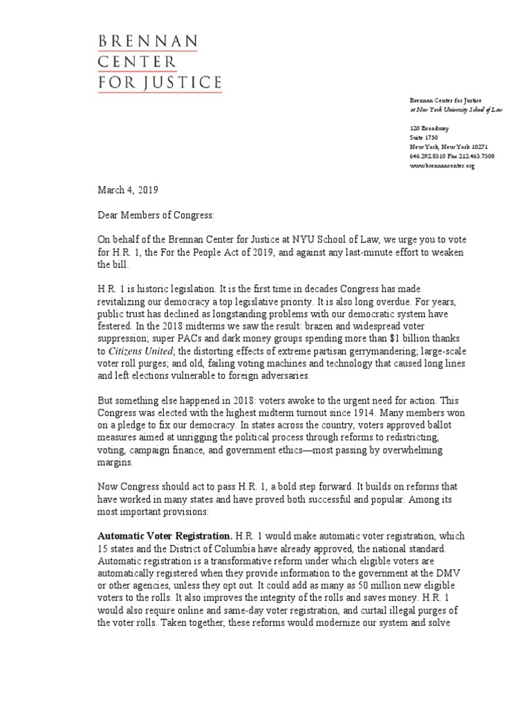 Brennan Center - Letter in Support of H.R. 1