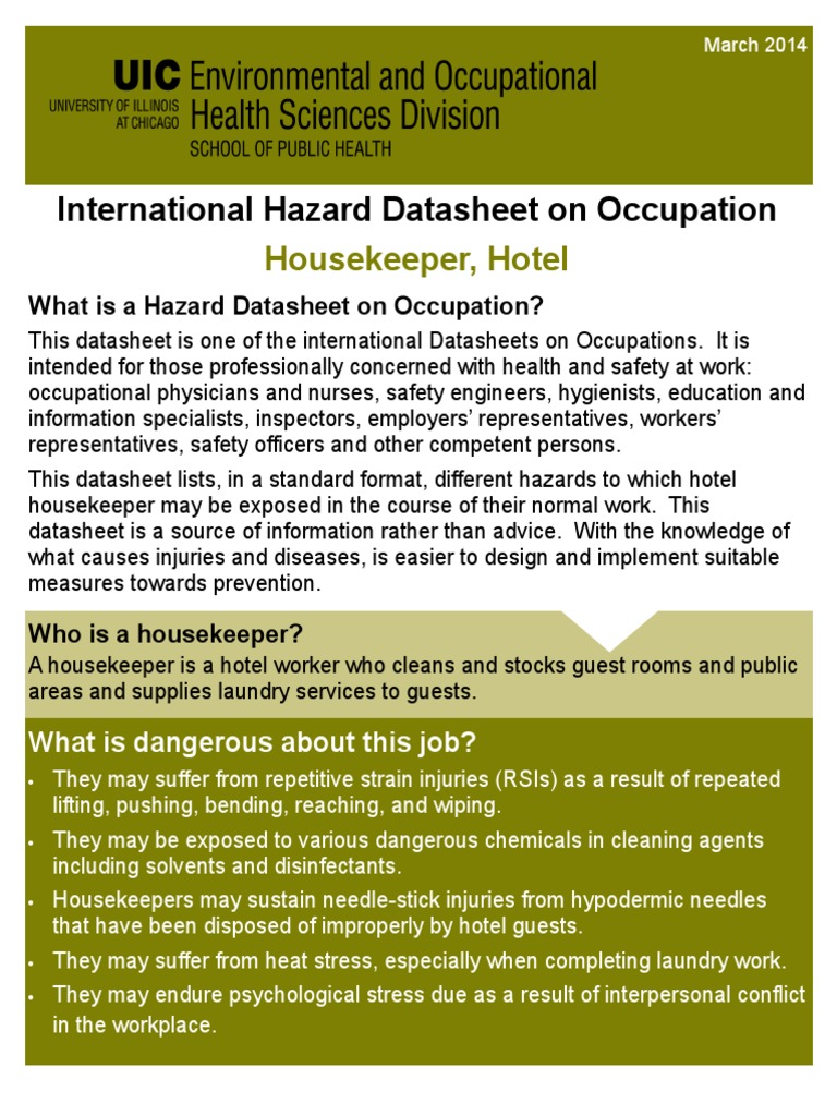 This Hazard Datasheet on Occupation was published by University of Illinois Chicago, School of Public Health, Environmental and Occupational Health Sciences