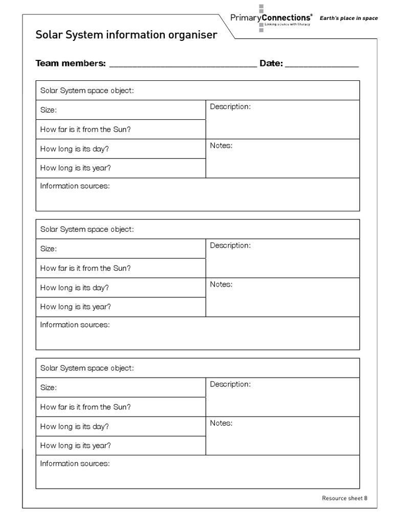This document is a worksheet for students to organize information about objects in the solar system. It includes sections for students to record the size, description, distance from the sun, length of day, length of year, and notes for 3 different solar system objects. Students are also prompted to list their information sources. The worksheet is intended to help students learn about the properties of objects in our solar system and where Earth fits relative to other bodies.